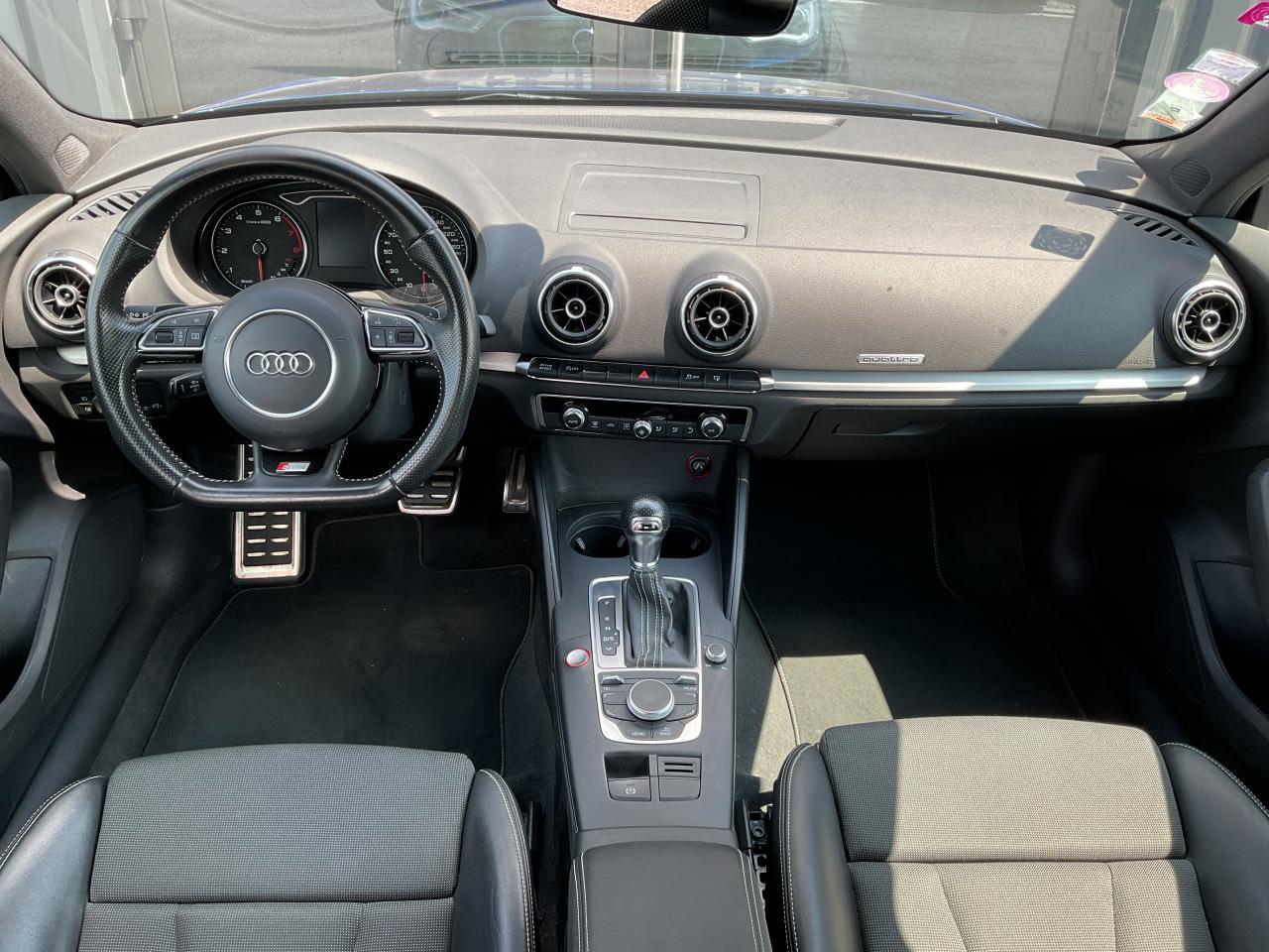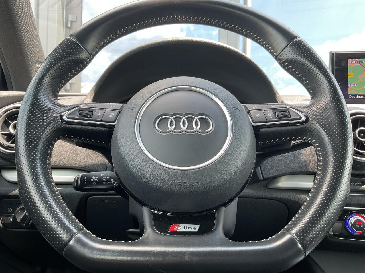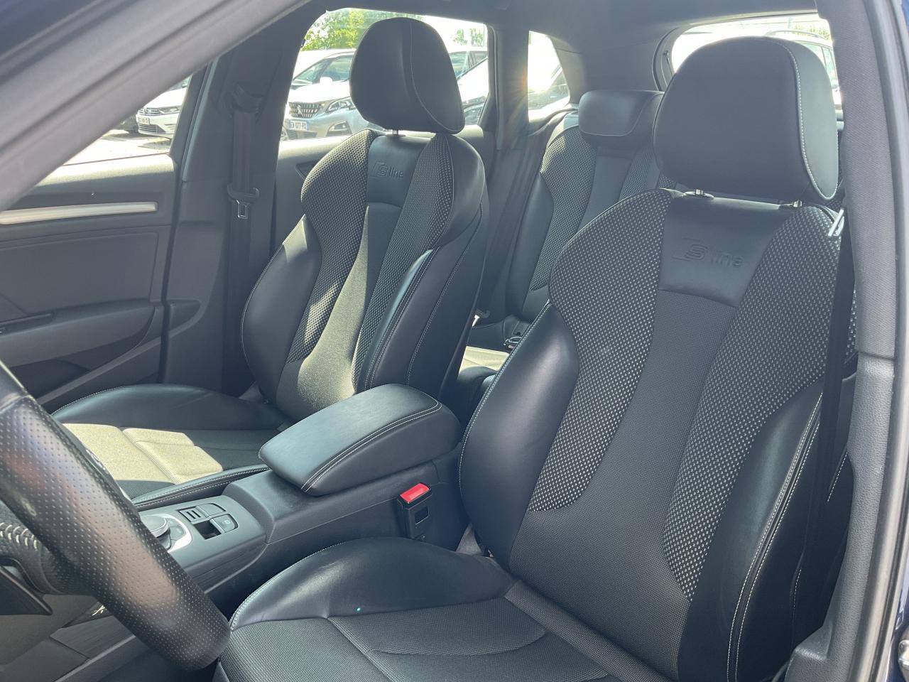 Accoudoir central avant coulissant en longueur, avec vide-poches relevable et inclinaison réglableAirbag de genoux coté conducteurAirbags grand volume pour conducteur et passager avantAirbags latéraux à l'avant intégrés au dossier des siègesAllume-cigare et cendrier amovible, couvercle chromé avec anneaux AudiAntipatinage (ASR)Applications décoratives sur les contre-portes et tableau de bord “Aluminium brossé mat”Audi drive select, permet différents réglages:Efficience, Confort, Dynamique, Auto et IndividuelAudi Singleframe avec encadrement chromé de la calandreBecquet de pavillon laqué dans la couleur de la carrosserie, avec inserts aérodynamiques latéraux noir brillantBlocage électronique de différentiel (EDS)Boîte à gants grand volume côté passager avant, éclairéeCache-bagages amovibleCarrosserie galvaniséeCeintures de sécurité 3 points automatiques pour toutes les places, prétensionneurs pyrotechniques, réglage des ceintures en hauteur à l'avant ; limiteurs de tension sur toutes les places extérieuresChâssis Sport, carrosserie surbaissée de 15 mm, avec suspension et amortisseurs plus fermesCiel de pavillon en tissu noirClimatisation automatique Confort avec réglage asservi à la position du soleilContrôle de ceinture attachée pour toutes les placesContrôle de la pression des pneusContrôle électronique de stabilisation (ESC) avec blocage transversal électroniqueContrôle électronique de stabilisation (ESC) désactivable, avec amplificateur hydraulique de freinage d'urgenceDétecteur de pluie et de luminosité incluant pare-brise avec bande grise sur la partie supérieureDirection assistée électromécanique avec assistance asservie à la vitesse (servotronic)Dossier de banquette arrière rabattable en deux parties 40/60 ou complètementEclairage intérieur à l'avant et à l'arrièreEcrous de roues antivolEssuie-glace arrière à déclenchement automatique au passage de la marche arrièreFeux arrière avec feux de recul blancs et feux de brouillard arrière, incluant troisième feu stop surélevé et éclairage de plaque à LEDFeux de freinage adaptatifsFixation pour sièges enfants ISOFIX et Top Tether pour les places arrière extérieuresIdentification du modèle/technologie sur le capot de coffreInscription “S line” sur les ailes avantJantes en aluminium coulé style 5 branches parallèles partiellement polies, 7,5 J x 18" avec pneus 225/40 R 18"Lave-essuie-glace 2 vitesses, 4 intervalles de balayage réglablesLève-vitres à l'avant et à l'arrière, électriques, avec protection antipincement, ouverture/fermeture par le verrouillage centralisé, fonction ouverture/fermeture par impulsionLunette arrière dégivrante, avec minuterieMiroir de courtoisie éclairéMMI RadioMoulures de seuils avec insert en aluminium et inscription “S line”Œilletons de fixation, 4 dans le coffre, pour maintenir les bagages et objets dans le coffre, points de fixation pour le filet mixte en optionOutillage de bord dans le coffre incluant un cricPack aluminium extérieurPack rangement et coffrePack rangement et coffrePare-brise acoustique, améliore l'isolation phonique du pare-brise et réduit les bruits extérieursPare-chocs dans la couleur de la carrosseriePare-soleil rabattables et pivotants, côtés conducteur et passager avant, avec miroir de courtoisie occultablePatères à vêtements sur les montants de pavillon centraux, à gauche et à droite, simplesPhares antibrouillard halogènes, intégrés à la jupe avantPoignées de maintien. 4 poignées avec mécanisme amortisseur, rabattables, encastrées dans le pavillonPommeau du levier/sélecteur de vitesses en cuir perforé noirPréparation pour téléphone portable (Bluetooth)Prise de courant 12 volts sur la console centrale à l'avantProtection antidémarrage électronique intégrée à la gestion du moteur ; activation automatique par la clé du véhiculeProtection latérale anticollision avec barres extrêmement rigides dans les portières et une structure latérale de carrosserie renforcéeRecommandation de repos qui analyse le comportement routier au moyen de différents capteursRégulateur de vitesseRétroviseur intérieur automatique jour/nuitRétroviseurs extérieurs avec clignotants à LED intégrés réglables électriquement et dégivrants, miroir asphérique à gauche, convexe à droite. Buses de lave-glace dégivrantesRoue de secours temporaire de type galetteSellerie mixte en tissu Biathlon et cuirSièges à l'avant avec positionnement en longueur et inclinaison de dossier réglables manuellementSièges conducteur et passager avant réglables en hauteurSièges Sport à l'avant avec bourrelets latérauxSignal sonore pour oubli d'extinction des feuxSorties d'échappement doubles à gauche chroméesSupport pour téléphone portable et clé avec compatiment séparé pour le rangement du téléphone portable et la clé du véhicule. Rangement intégré avec encadrement chromé sur la console centraleSystème d'airbags de têteSystème d'information du conducteur avec écran couleur haute résolution de 3,5 poucesSystème de freinage avec antiblocage (ABS) et répartiteur électronique de freinage (EBV)Système de ventilation et chauffage 4 diffuseurs d'air rondsTapis complémentaires à l'avant et à l'arrière assortis à la couleur de la moquetteTémoins de contrôle pour, entre autres : airbag, ABS, ESC/ASR, frein de stationnement serré, électronique EDS, phares, clignotants, circuit de freinage, pression d'huile moteur, fermeture du coffre, système électrique du moteur, système de pr&eacuTriangle de présignalisation fixé sur l'intérieur du capot du coffreTrousse de secours dans le vide-poches sous le siège passagerVerrouillage centralisé à télécommandeVide-poches sur les habillages des portières ainsi que sur la console centrale avec porte-boissonVolant réglable en hauteur et en profondeurVolant Sport 3 branches multifonction en cuir badgé S line avec méplat et po