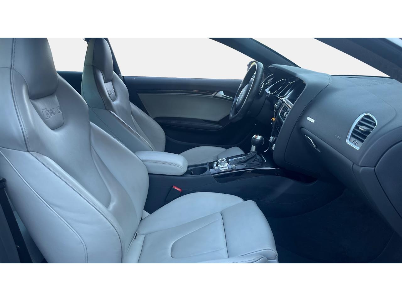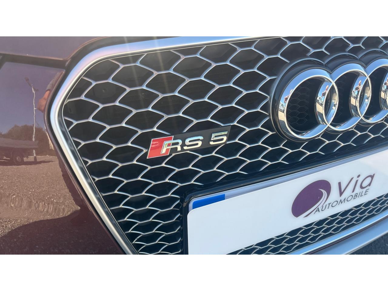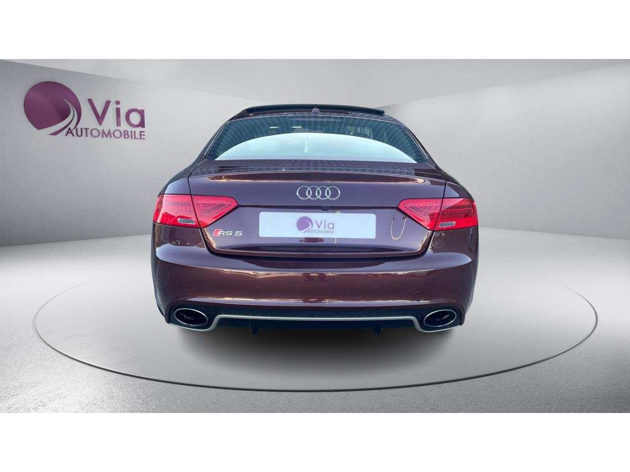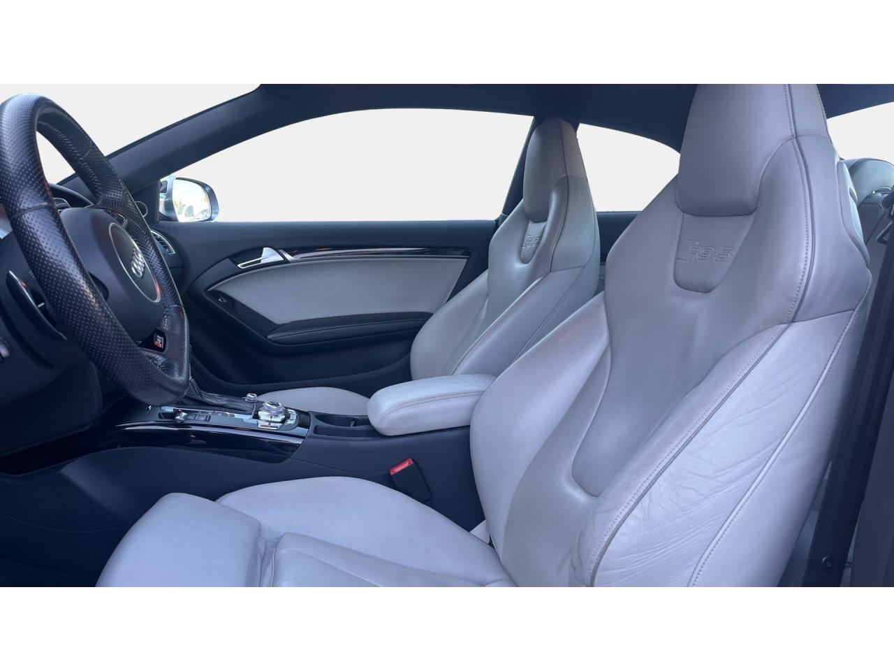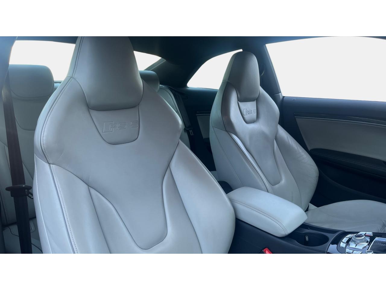 4 œilletons de fixation dans le coffre, pour maintenir les bagages et objets ; points d'accrochage pour le filet mixteAccoudoir central avant avec vide-pochesAccoudoir central dans le dossier des sièges arrière, rabattable ; compartiment avec trousse de secoursAccoudoirs de portières avant et accoudoirs arrière garnis de cuir de la couleur de la sellerieAdvanced Key : système d'autorisation d'accès et de démarrage main libreAirbags grand volume pour conducteur et passager avant avec détecteur de la position d'assise ; airbag adaptatif pour le conducteur et passager avantAirbags latéraux (airbag thorax et bassin à l'avant)Alarme antivol (surveille l'habitacle, autoradio, portes, capot moteur et de coffre, inclut protection antiremorquage)Alarme antivol avec fonction safelockAllume-cigare intégré dans le cendrierAntipatinage ASR pour une motricité optimale, empêche le patinage des roues motricesApplications décoratives en carbone sur contre-portes et console centraleApplications spécifiques en piano laqué noir autour de l'instrumentation et de l'écran du MMIAppuie-têtes intégrés à l'avant et à l'arrièreAudi Drive SelectAudi Hold Assist : système désactivable maintenant le véhicule à l'arrêt en descente comme en côte; permet un redémarrage confortable sans mettre le frein à mainAudi Premium Tracking System : système de localisation et d'immobilisation par satellite couplé à l'alarme antivolAvertisseur deux tons avec commande au centre du volantBlocage électronique de différentiel EDS, aide au démarrage intervenant jusqu'à une vitesse d'environ 100 km/h, freinant automatiquement les roues motrices sur route glissante et inégalement adhérenteBoîte automatique S tronic 7 vitesses à double embrayage, passage en mode manuel possible à l'aide du sélecteur ou des palettes situées derrière le volantBouclier avant avec larges prises d'air en structure nid d'abeilles, avec double baguette horizontale et lame de bas de bouclier anthracite brillantes ; bouclier arrière avec diffuseur en structure nid d'abeilles, sorties d'échappement intégrées et lamCalandre Singleframe : grille anthracite brillante en structure nid d'abeilles et cadre en aluminium matCapot de coffre à ouverture automatique, lors du déverrouillage du coffre par la télécommande ou par actionnement de la touche douce sur le capot du coffre Fermeture manuelleCarrosserie galvaniséeCeintures de sécurité, automatiques à 3 points pour les 4 places, contrôle de port de ceinture à l'avant, couleur assortie à celle de l'habitacleCendrier sur la console centrale à l'avant et à l'arrièreChâssis Sport RS avec suspension et amortisseurs plus fermes pour un contact plus direct avec la chaussée et une conduite sportiveCiel de pavillon en tissu noir ou Argent lunaire au choixClimatisation automatique Confort 3 zones à fonctionnalités étendues et affichage numériqueColonne de direction de sécuritéContact d'allumage électronique ; clé de contact pouvant mémoriser différentes données d'entretienContrôle de pression des pneus : vérifie durant la marche la pression de chacune des rouesContrôle électronique de stabilisation ESC, relie ABS, ASR et EDS à ses propres capteurs et compare les données de conduite avec les données de référenceCric, rangé dans le coffreDésactivation de l'airbag passager (désactive aussi l'airbag latéral passager)Détecteur de pluie et allumage automatique des projecteursDossier des sièges arrière rabattable séparément, avec déverrouillage à distance des dossiers depuis le coffreEclairage intérieur à extinction temporisée et contacteurs sur toutes les portièresEcrous antivolEntourage de vitres en aluminium, revêtement noir brillant sur les montants de pavillon centraux et les triangles des portières arrièreÉtriers de freins laqués noir avec logo RSÉtui à lunettes, dans le module d'éclairage intérieur avant, au-dessus du rétroviseur intérieurFrein de stationnement electromécaniqueGPS AdvancedIndicateur d'usure des disques à l'avant, affichage sur le système d'information du conducteurIndicateur de rapport de vitesse dans le système d'information du conducteurIndicateur de température extérieure dans le système d'information du conducteur, en cas de températures inférieures à +5 °C, un cristal de glace apparaît sur l'afficheur, avertissant de la possibilité de verglasInscriptions RS 5 sur les seuils de portes, la calandre, la malle de coffre, le volant, le levier de vitesses S tronic, le compte-tours et la cléInstrumentation à éclairage réglable, tachymètre électronique avec compteur kilométrique totalisateur et journalier, compte-tours, horloge, indicateur de température du liquide de refroidissement et jauge de carburantJantes en aluminium forgé style 10 branches fines, 9 J x 19”, avec pneus 265/35 R19Lave-glace, deux vitesses, 4 réglages d'intermittence, balayage coup par coup et lavage-balayage automatiqueLecteur DVDLève-vitres avant électriques avec protection antipincement et fonction confort d'ouverture/fermeture par impulsion ; vitres arrière fixesLimiteurs d'effort des ceintures de sécurité avantLunette arrière dégivrante avec minuterieMoulures de seuils de portes avec insert en aluminium badgé RS 5Ordinateur de bord couleur et système de contrôle autocheck (incluant programme efficiency)Outillage de bord dans le coffrePack EclairageParking System PlusPédalier et repose-pied style aluminiumPoignées de maintien, amorties, rabattables dans les deux sens encastrées dans le ciel de pavillonPoignées de portières extérieures laquées dans la couleur de carrosserie, poignées cintrées agréables à utiliserPommeau de levier de vitesses en cuir perforé avec badge RS 5 ; soufflet en cuir avec surpiqûres gris pierrePorte-boissons sur la console centralePréparation ISOFIX pour sièges latéraux arrière et siège passager avantPréparation pour téléphone 2 W bi-bande (D et E), san