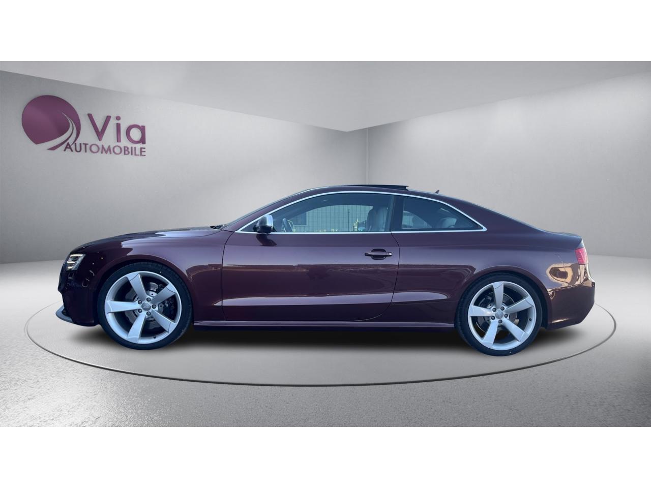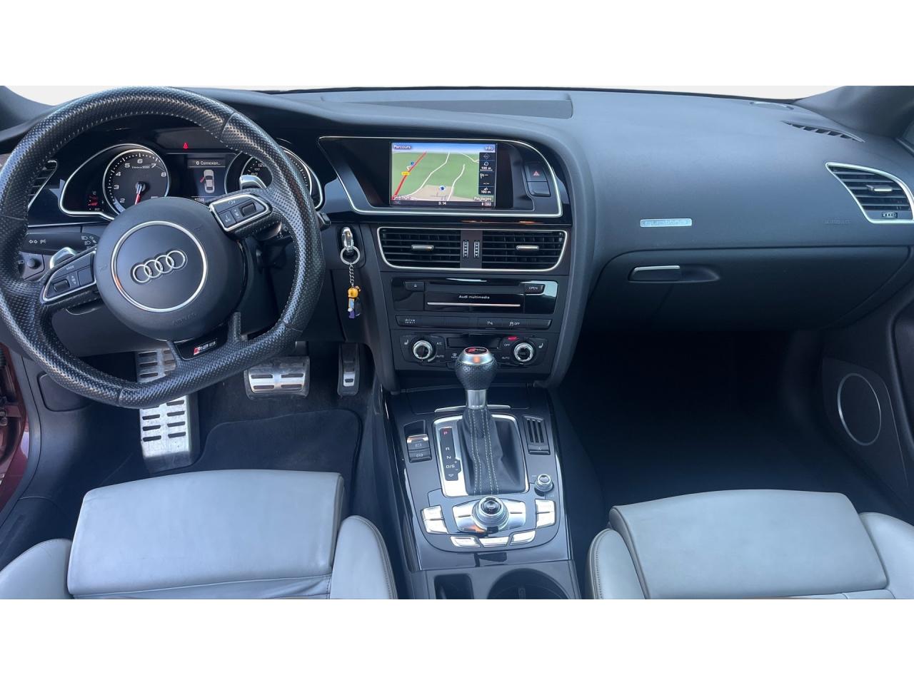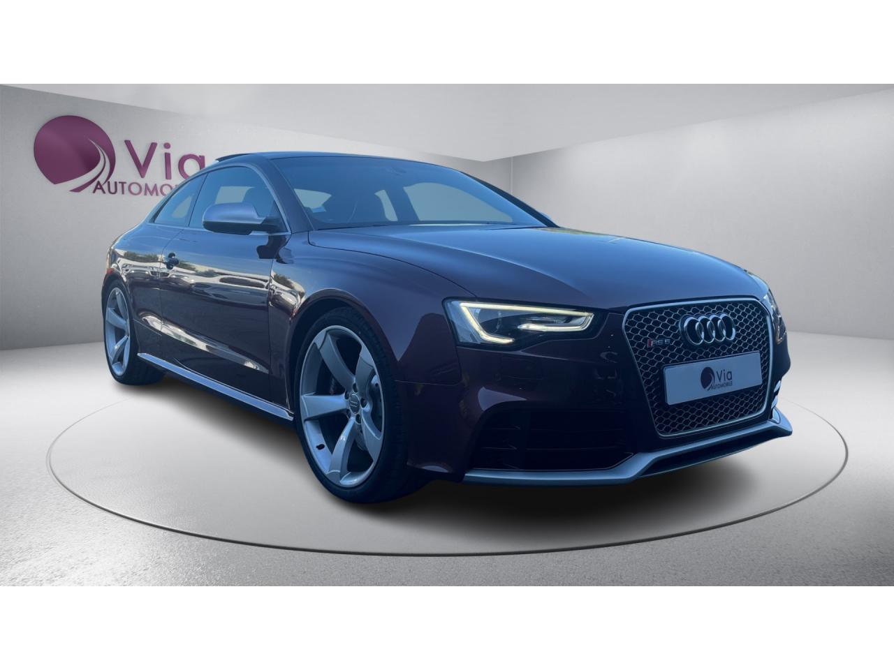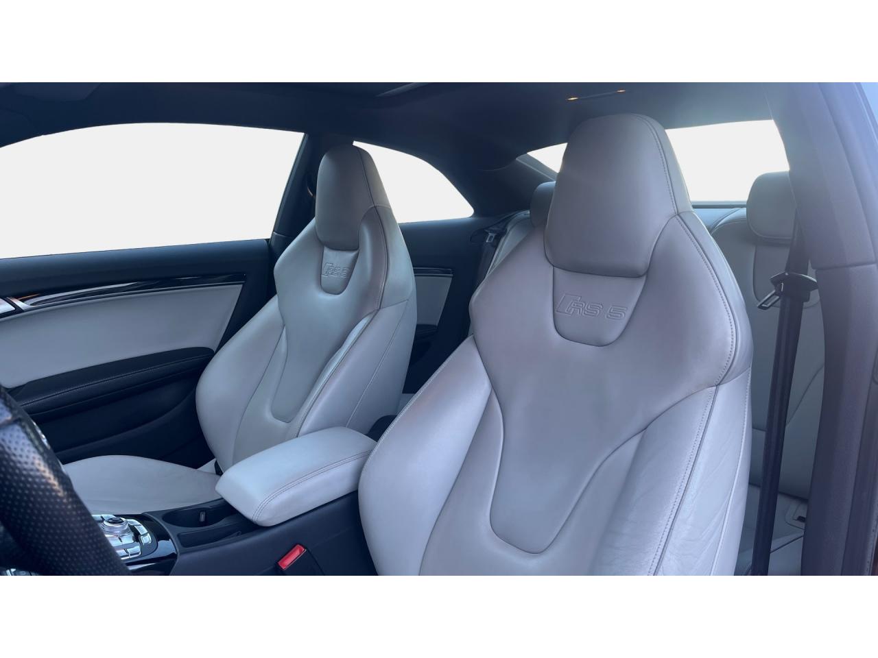 4 œilletons de fixation dans le coffre, pour maintenir les bagages et objets ; points d'accrochage pour le filet mixteAccoudoir central avant avec vide-pochesAccoudoir central dans le dossier des sièges arrière, rabattable ; compartiment avec trousse de secoursAccoudoirs de portières avant et accoudoirs arrière garnis de cuir de la couleur de la sellerieAdvanced Key : système d'autorisation d'accès et de démarrage main libreAirbags grand volume pour conducteur et passager avant avec détecteur de la position d'assise ; airbag adaptatif pour le conducteur et passager avantAirbags latéraux (airbag thorax et bassin à l'avant)Alarme antivol (surveille l'habitacle, autoradio, portes, capot moteur et de coffre, inclut protection antiremorquage)Alarme antivol avec fonction safelockAllume-cigare intégré dans le cendrierAntipatinage ASR pour une motricité optimale, empêche le patinage des roues motricesApplications décoratives en carbone sur contre-portes et console centraleApplications spécifiques en piano laqué noir autour de l'instrumentation et de l'écran du MMIAppuie-têtes intégrés à l'avant et à l'arrièreAudi Drive SelectAudi Hold Assist : système désactivable maintenant le véhicule à l'arrêt en descente comme en côte; permet un redémarrage confortable sans mettre le frein à mainAudi Premium Tracking System : système de localisation et d'immobilisation par satellite couplé à l'alarme antivolAvertisseur deux tons avec commande au centre du volantBlocage électronique de différentiel EDS, aide au démarrage intervenant jusqu'à une vitesse d'environ 100 km/h, freinant automatiquement les roues motrices sur route glissante et inégalement adhérenteBoîte automatique S tronic 7 vitesses à double embrayage, passage en mode manuel possible à l'aide du sélecteur ou des palettes situées derrière le volantBouclier avant avec larges prises d'air en structure nid d'abeilles, avec double baguette horizontale et lame de bas de bouclier anthracite brillantes ; bouclier arrière avec diffuseur en structure nid d'abeilles, sorties d'échappement intégrées et lamCalandre Singleframe : grille anthracite brillante en structure nid d'abeilles et cadre en aluminium matCapot de coffre à ouverture automatique, lors du déverrouillage du coffre par la télécommande ou par actionnement de la touche douce sur le capot du coffre Fermeture manuelleCarrosserie galvaniséeCeintures de sécurité, automatiques à 3 points pour les 4 places, contrôle de port de ceinture à l'avant, couleur assortie à celle de l'habitacleCendrier sur la console centrale à l'avant et à l'arrièreChâssis Sport RS avec suspension et amortisseurs plus fermes pour un contact plus direct avec la chaussée et une conduite sportiveCiel de pavillon en tissu noir ou Argent lunaire au choixClimatisation automatique Confort 3 zones à fonctionnalités étendues et affichage numériqueColonne de direction de sécuritéContact d'allumage électronique ; clé de contact pouvant mémoriser différentes données d'entretienContrôle de pression des pneus : vérifie durant la marche la pression de chacune des rouesContrôle électronique de stabilisation ESC, relie ABS, ASR et EDS à ses propres capteurs et compare les données de conduite avec les données de référenceCric, rangé dans le coffreDésactivation de l'airbag passager (désactive aussi l'airbag latéral passager)Détecteur de pluie et allumage automatique des projecteursDossier des sièges arrière rabattable séparément, avec déverrouillage à distance des dossiers depuis le coffreEclairage intérieur à extinction temporisée et contacteurs sur toutes les portièresEcrous antivolEntourage de vitres en aluminium, revêtement noir brillant sur les montants de pavillon centraux et les triangles des portières arrièreÉtriers de freins laqués noir avec logo RSÉtui à lunettes, dans le module d'éclairage intérieur avant, au-dessus du rétroviseur intérieurFrein de stationnement electromécaniqueGPS AdvancedIndicateur d'usure des disques à l'avant, affichage sur le système d'information du conducteurIndicateur de rapport de vitesse dans le système d'information du conducteurIndicateur de température extérieure dans le système d'information du conducteur, en cas de températures inférieures à +5 °C, un cristal de glace apparaît sur l'afficheur, avertissant de la possibilité de verglasInscriptions RS 5 sur les seuils de portes, la calandre, la malle de coffre, le volant, le levier de vitesses S tronic, le compte-tours et la cléInstrumentation à éclairage réglable, tachymètre électronique avec compteur kilométrique totalisateur et journalier, compte-tours, horloge, indicateur de température du liquide de refroidissement et jauge de carburantJantes en aluminium forgé style 10 branches fines, 9 J x 19”, avec pneus 265/35 R19Lave-glace, deux vitesses, 4 réglages d'intermittence, balayage coup par coup et lavage-balayage automatiqueLecteur DVDLève-vitres avant électriques avec protection antipincement et fonction confort d'ouverture/fermeture par impulsion ; vitres arrière fixesLimiteurs d'effort des ceintures de sécurité avantLunette arrière dégivrante avec minuterieMoulures de seuils de portes avec insert en aluminium badgé RS 5Ordinateur de bord couleur et système de contrôle autocheck (incluant programme efficiency)Outillage de bord dans le coffrePack EclairageParking System PlusPédalier et repose-pied style aluminiumPoignées de maintien, amorties, rabattables dans les deux sens encastrées dans le ciel de pavillonPoignées de portières extérieures laquées dans la couleur de carrosserie, poignées cintrées agréables à utiliserPommeau de levier de vitesses en cuir perforé avec badge RS 5 ; soufflet en cuir avec surpiqûres gris pierrePorte-boissons sur la console centralePréparation ISOFIX pour sièges latéraux arrière et siège passager avantPréparation pour téléphone 2 W bi-bande (D et E), san