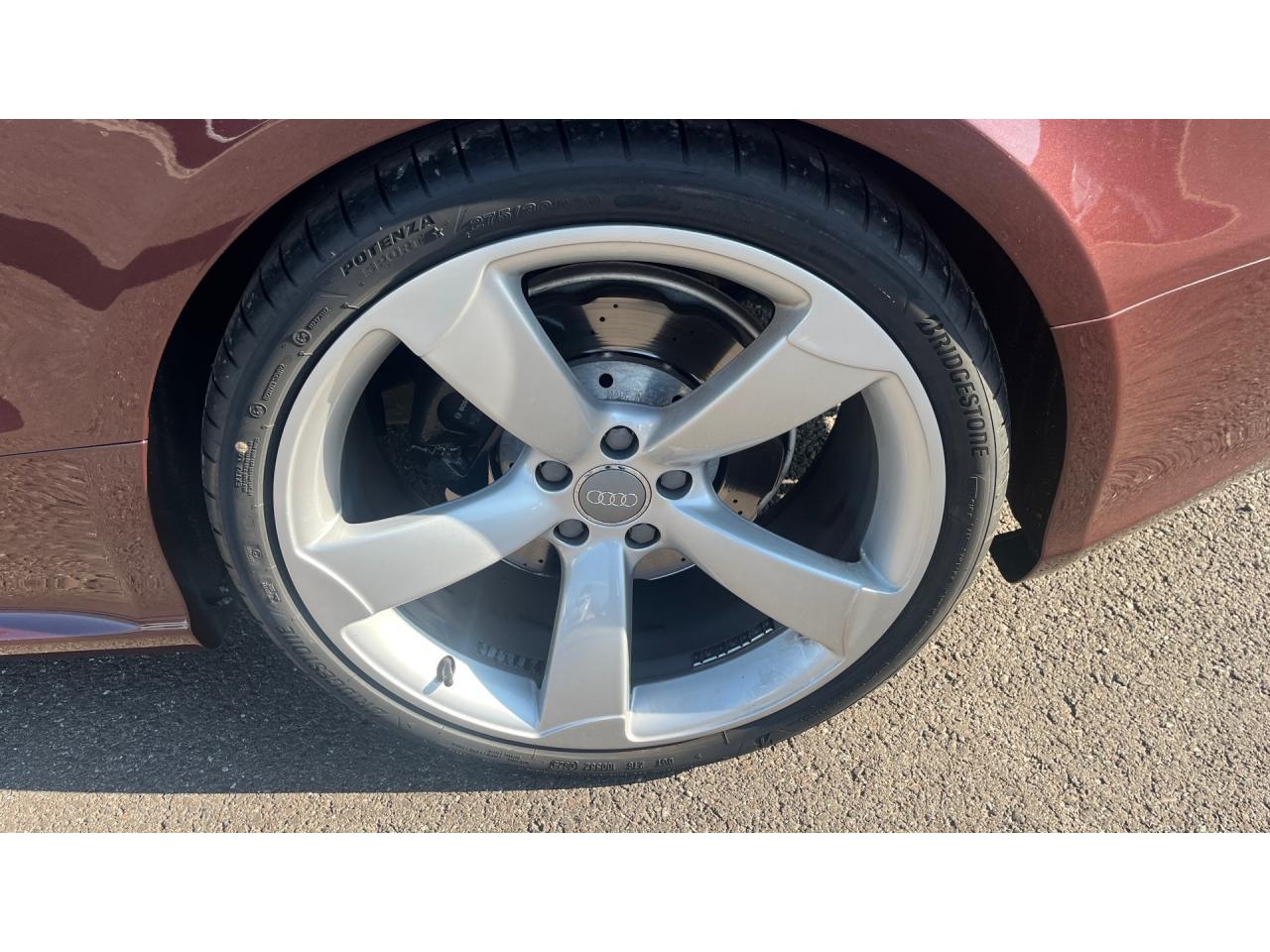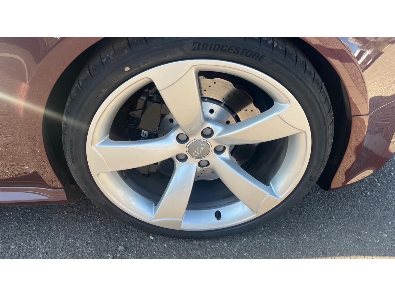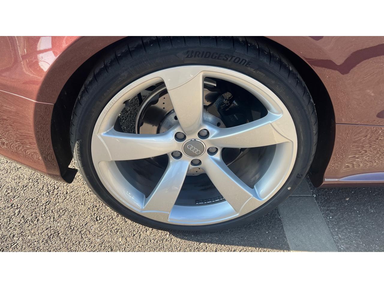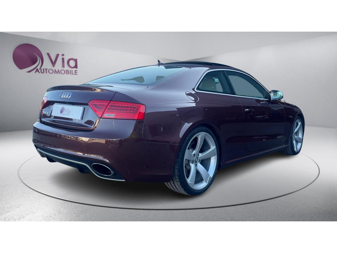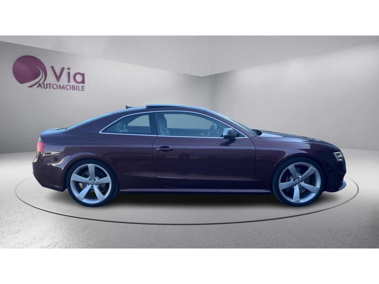 4 œilletons de fixation dans le coffre, pour maintenir les bagages et objets ; points d'accrochage pour le filet mixteAccoudoir central avant avec vide-pochesAccoudoir central dans le dossier des sièges arrière, rabattable ; compartiment avec trousse de secoursAccoudoirs de portières avant et accoudoirs arrière garnis de cuir de la couleur de la sellerieAdvanced Key : système d'autorisation d'accès et de démarrage main libreAirbags grand volume pour conducteur et passager avant avec détecteur de la position d'assise ; airbag adaptatif pour le conducteur et passager avantAirbags latéraux (airbag thorax et bassin à l'avant)Alarme antivol (surveille l'habitacle, autoradio, portes, capot moteur et de coffre, inclut protection antiremorquage)Alarme antivol avec fonction safelockAllume-cigare intégré dans le cendrierAntipatinage ASR pour une motricité optimale, empêche le patinage des roues motricesApplications décoratives en carbone sur contre-portes et console centraleApplications spécifiques en piano laqué noir autour de l'instrumentation et de l'écran du MMIAppuie-têtes intégrés à l'avant et à l'arrièreAudi Drive SelectAudi Hold Assist : système désactivable maintenant le véhicule à l'arrêt en descente comme en côte; permet un redémarrage confortable sans mettre le frein à mainAudi Premium Tracking System : système de localisation et d'immobilisation par satellite couplé à l'alarme antivolAvertisseur deux tons avec commande au centre du volantBlocage électronique de différentiel EDS, aide au démarrage intervenant jusqu'à une vitesse d'environ 100 km/h, freinant automatiquement les roues motrices sur route glissante et inégalement adhérenteBoîte automatique S tronic 7 vitesses à double embrayage, passage en mode manuel possible à l'aide du sélecteur ou des palettes situées derrière le volantBouclier avant avec larges prises d'air en structure nid d'abeilles, avec double baguette horizontale et lame de bas de bouclier anthracite brillantes ; bouclier arrière avec diffuseur en structure nid d'abeilles, sorties d'échappement intégrées et lamCalandre Singleframe : grille anthracite brillante en structure nid d'abeilles et cadre en aluminium matCapot de coffre à ouverture automatique, lors du déverrouillage du coffre par la télécommande ou par actionnement de la touche douce sur le capot du coffre Fermeture manuelleCarrosserie galvaniséeCeintures de sécurité, automatiques à 3 points pour les 4 places, contrôle de port de ceinture à l'avant, couleur assortie à celle de l'habitacleCendrier sur la console centrale à l'avant et à l'arrièreChâssis Sport RS avec suspension et amortisseurs plus fermes pour un contact plus direct avec la chaussée et une conduite sportiveCiel de pavillon en tissu noir ou Argent lunaire au choixClimatisation automatique Confort 3 zones à fonctionnalités étendues et affichage numériqueColonne de direction de sécuritéContact d'allumage électronique ; clé de contact pouvant mémoriser différentes données d'entretienContrôle de pression des pneus : vérifie durant la marche la pression de chacune des rouesContrôle électronique de stabilisation ESC, relie ABS, ASR et EDS à ses propres capteurs et compare les données de conduite avec les données de référenceCric, rangé dans le coffreDésactivation de l'airbag passager (désactive aussi l'airbag latéral passager)Détecteur de pluie et allumage automatique des projecteursDossier des sièges arrière rabattable séparément, avec déverrouillage à distance des dossiers depuis le coffreEclairage intérieur à extinction temporisée et contacteurs sur toutes les portièresEcrous antivolEntourage de vitres en aluminium, revêtement noir brillant sur les montants de pavillon centraux et les triangles des portières arrièreÉtriers de freins laqués noir avec logo RSÉtui à lunettes, dans le module d'éclairage intérieur avant, au-dessus du rétroviseur intérieurFrein de stationnement electromécaniqueGPS AdvancedIndicateur d'usure des disques à l'avant, affichage sur le système d'information du conducteurIndicateur de rapport de vitesse dans le système d'information du conducteurIndicateur de température extérieure dans le système d'information du conducteur, en cas de températures inférieures à +5 °C, un cristal de glace apparaît sur l'afficheur, avertissant de la possibilité de verglasInscriptions RS 5 sur les seuils de portes, la calandre, la malle de coffre, le volant, le levier de vitesses S tronic, le compte-tours et la cléInstrumentation à éclairage réglable, tachymètre électronique avec compteur kilométrique totalisateur et journalier, compte-tours, horloge, indicateur de température du liquide de refroidissement et jauge de carburantJantes en aluminium forgé style 10 branches fines, 9 J x 19”, avec pneus 265/35 R19Lave-glace, deux vitesses, 4 réglages d'intermittence, balayage coup par coup et lavage-balayage automatiqueLecteur DVDLève-vitres avant électriques avec protection antipincement et fonction confort d'ouverture/fermeture par impulsion ; vitres arrière fixesLimiteurs d'effort des ceintures de sécurité avantLunette arrière dégivrante avec minuterieMoulures de seuils de portes avec insert en aluminium badgé RS 5Ordinateur de bord couleur et système de contrôle autocheck (incluant programme efficiency)Outillage de bord dans le coffrePack EclairageParking System PlusPédalier et repose-pied style aluminiumPoignées de maintien, amorties, rabattables dans les deux sens encastrées dans le ciel de pavillonPoignées de portières extérieures laquées dans la couleur de carrosserie, poignées cintrées agréables à utiliserPommeau de levier de vitesses en cuir perforé avec badge RS 5 ; soufflet en cuir avec surpiqûres gris pierrePorte-boissons sur la console centralePréparation ISOFIX pour sièges latéraux arrière et siège passager avantPréparation pour téléphone 2 W bi-bande (D et E), san