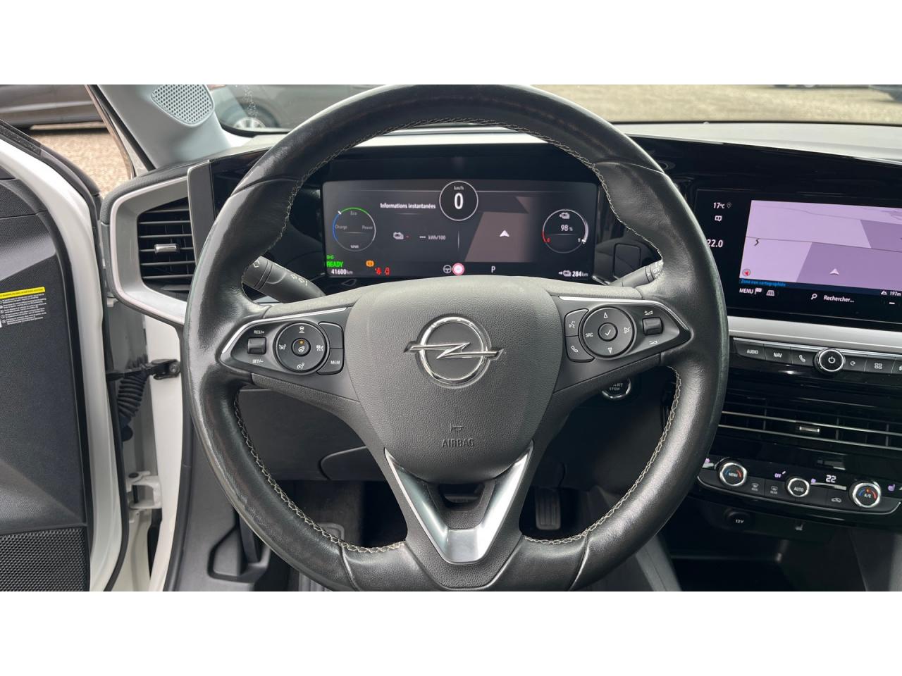 2 prises USB AR3 appuie-tête arrière6 airbags (frontaux, latéraux et rideaux)Accoudoir conducteur avec porte-gobeletAide actif au maintien dans la voieAide au démarrage en côteAppuie-têtes avant réglablesAssistant de feux de routeBarre chromée sous pare-chocs avantCâble de recharge Mode 2 - 3,7Kw Green UpCalandre Opel VizorChargeur embarqué monophasé 7,4 KWClimatisation automatique mono-zoneCoques de rétroviseurs noiresDirection assistéeDouble plancher de coffre à bagages, amovibleEclairage d'ambiance à LEDEcran d'instrumentation couleur 7''Ecran digital 7'' compatible avec Apple CarPlay et Android Auto, incluant les services de navigation TomTom Live incluant 6 haut parleurs, Mirrorlink, DAB+,une prise USB (type-A) & le module Opel ConnectFeux arrière à LEDFeux de jour à LEDFrein à main électriqueJantes en alliage 17'' 5 double branches, Bi-color Argent / NoirKit anti-crevaisonLigne de contour de Vizor chroméeLigne de vitrage chroméeMiroir de courtoisie sur le pare-soleil côté passagerPack City 180°Pack VisibilitéPalettes au volantPhares Avant ECO LEDPlafonnier avec double spot de lecturePoignées de portes intérieures chroméesProjecteurs antibrouillardReconnaissance des panneaux de signalisation amélioréeRégulateur et limiteur de vitesseSécurité enfant aux portes arrièreSellerie Confort mixte Revolution Birdie GreySiège conducteur réglable dans 6 directionsSiège passager réglable dans 6 directionsSpoiler arrière noirSystème anti-blocage des roues ABSSystème anti-collision à basse vitesse et détection des piétonsSystème d'entrée et de démarrage sans cléSystème de détection de la somnolence du conducteurSystème ISOFIX sur sièges arrièreToit couleur carrosserieVitres avant et arrière électriquesVolant en cuir multifonction 3 branches avec méplat