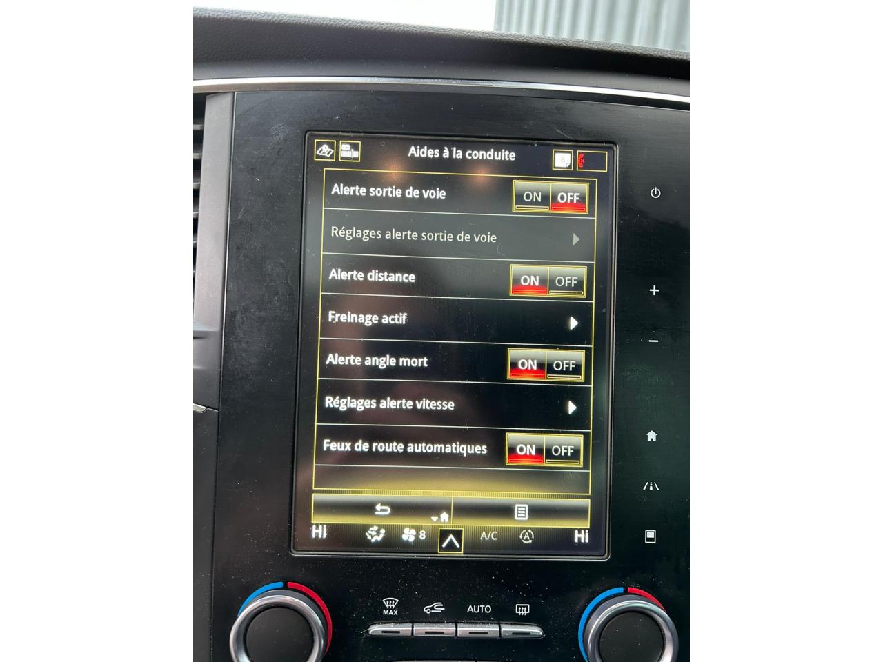ABS avec aide au freinage d'urgenceAffichage tête hauteAide au démarrage en côteAide au parking avantAide au stationnement arrièreAirbags frontaux conducteur et passager adaptatifs (airbag passager déconnectable)Airbags latéraux (thorax / bassin) avantAirbags rideaux de têtes aux places avant et arrièreAlerte de franchissement de ligneAlerte de survitesse avec reconnaissance des panneaux de signalisationAmbiance lumineuse personnalisableBaguettes intérieures de porte et de planche de bord avec décors aluminium brosséBanquette AR rabattable 1/3 - 2/3 avec système Easy BreakBarres de toit longitudinales anodiséesCaméra de reculCanule d'échappement chroméeCapteur de toxicité avec recyclage d'airCapteurs de pluie et de luminositéCarte Renault mains-libres (accès, démarrage, condamnation à l'éloignement)Climatisation automatique bizoneCommutation automatique des feux de croisement et de route, Light AssistCompartimentage de coffreCompatibilité Apple CarPlay et Android AutoCompteur digital TFT 7“ avec matrice couleurCondamnation automatique des ouvrants en roulantConsole centrale avec accoudoir et compartiment de rangementEclairage d'ambiance sur la console centraleEclairage d‘ambiance sur les panneaux de portes avant et arrièreEclairage plafonnier avant et arrière à LEDFeux de jour à guide de lumière LED et effet 3DFeux de jour arrière LED 3D Edge LightFrein de parking assistéGrille de calandre avant chroméeInserts chromés de haut-parleurs avantJantes design 17'' Bayadere Gris ErbéJupes AR noire brillantKit de réparation des pneusLécheurs de vitres chromésLève-vitres arrière électriques impulsionnelsLève-vitres avant électriques impulsionnelsPack R-Link 2Pack SécuritéPare-soleil avec miroir de courtoisie éclairéPlancher de coffre avec double positionPoignées de porte avec jonc chroméPoignées de portes ton caissePrise 12 V à l'arrièrePrise 12V à l'avantProgramme Eco-modeProjecteurs antibrouillard avantProjecteurs avant Full Led Pure VisionRégulateur et limiteur de vitesseRenault Multi-SenseRépétiteurs de clignotant à LED intégrés aux rétroviseursRétroviseur intérieur automatique jour/nuitRétroviseurs extérieurs électriques et dégivrantsRétroviseurs extérieurs ton carrosserieRétroviseurs rabattables électriquementSellerie mixte similicuir / velours noirSéquence d‘accueil à l‘ouverture du véhicule avec éclairage de signature lumineuseSeuils de portes avant inox avec marquage MeganeSiège conducteur avec réglage lombaireSiège passager réglable en hauteurSurtapis confortSystème de contrôle de trajectoire (ESC) et fonction antipatinage (ASR)Système de fixations ISOFIX aux 2 places latérales arrièreSystème de surveillance de la pression des pneusVitres et lunette arrière surteintéesVolant Cuir NappaVolant multifonctionVolant réglable en hauteur et en profondeur